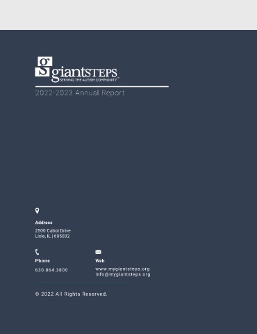2022-2023 Annual Report Address 2500 Cabot Drive Lisle, IL | 605032 Phone Web 630.864.3800 www.mygiantsteps.org info@mygiantsteps.org © 2022 All Rights Reserved.