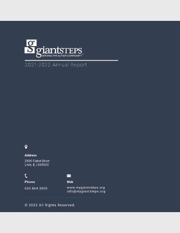 2021-2022 Annual Report Address 2500 Cabot Drive Lisle, IL | 605032 Phone Web 630.864.3800 www.mygiantsteps.org info@mygiantsteps.org © 2022 All Rights Reserved.