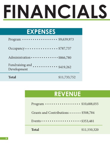 FINANCIALS EXPENSES Program $9,639,973 Occupancy $787,737 Administration $866,780 Fundraising and $419,262 Development Total $11,733,752 REVENUE Program $10,688,055 Grants and Contributions $508,784 Events $353,481 Total $11,550,320 9•